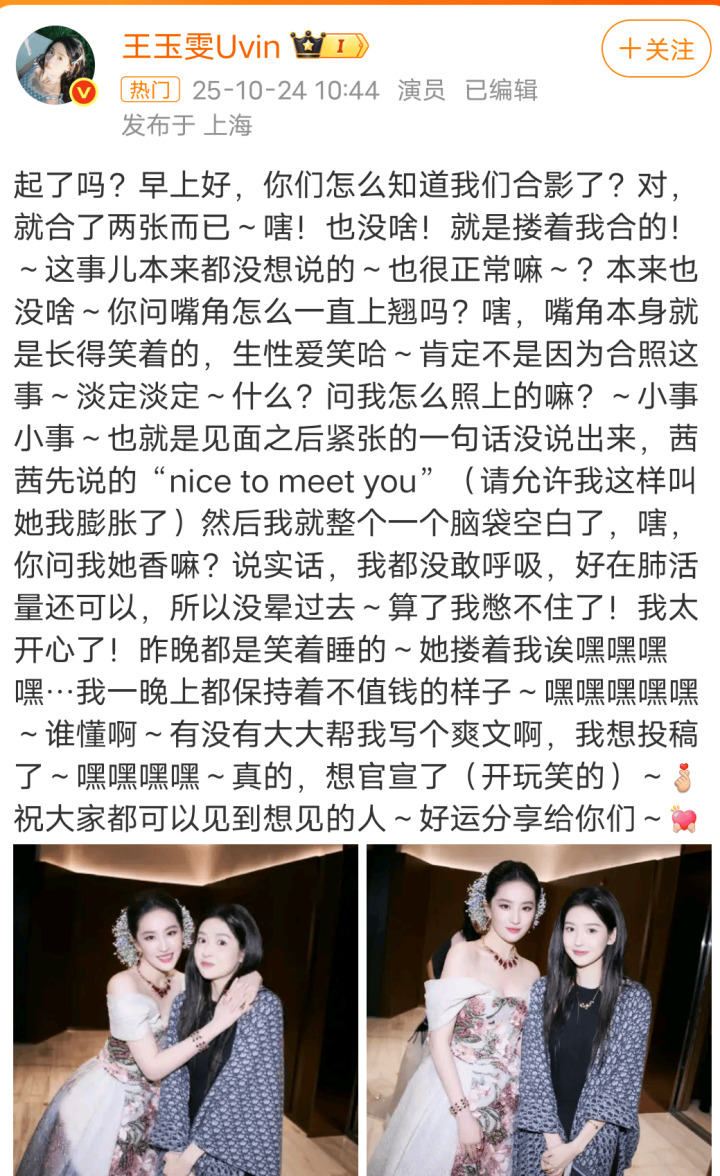 王玉雯在微博上发文,用“想和刘亦菲官宣了”来表达自己激动到飞起的心情。这哪是简单的“想官宣”,分明就是中了头奖式的狂喜,把网友们都给逗乐了。大家纷纷调侃:“像极了朋友圈追星发疯现场!”“王玉雯这是要把我们这些凡人给酸死的节奏啊!”“这搂着合的照,怕是要被王玉雯供起来当传家宝了!”